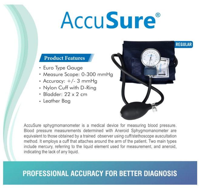 Get the AccuSure Aneroid Sphygmomanometer (Euro Type Gauge) at the best wholesale & retail prices only at Shivani Medicos – Your Trusted Surgical & Healthcare Hub in Gurgaon.